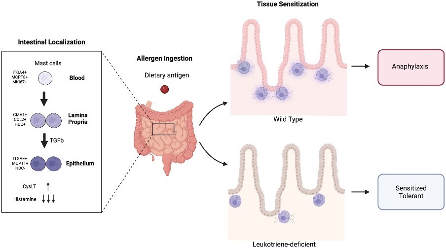 Тогда были изучены функциональные различия тучных клеток. Сравнительный анализ показал, что энтеральные тучные клетки преимущественно секретируют лейкотриены, тогда как тканевые внекишечные — гистамин. Это объясняет, почему блокада биосинтеза лейкотриенов препаратом зилеутон эффективно предотвращала развитие анафилаксии только при оральном введении аллергена. В модели мышей терапия зилеутоном предотвращала ключевые клинические признаки анафилаксии (гипотермия, сосудистый коллапс).