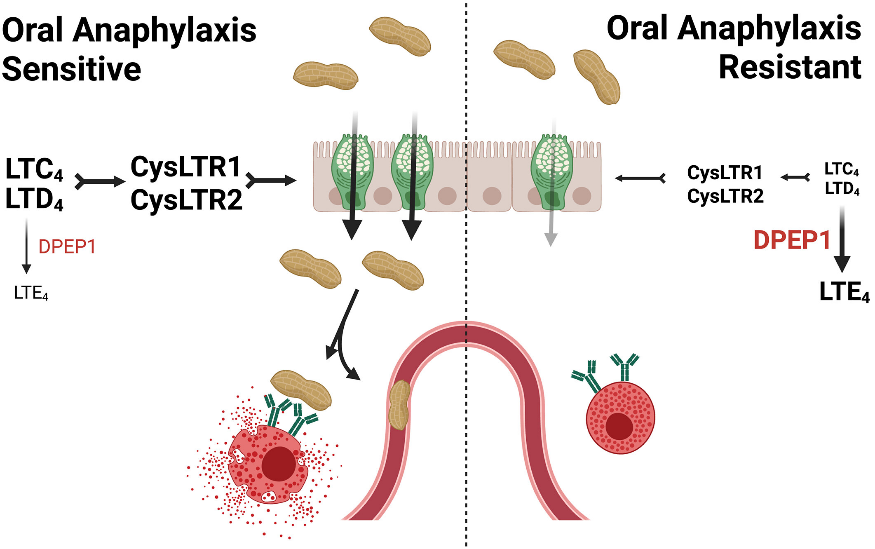 Команда ученых во главе со Стефани Айсенбарт из Северо-Западного университета с использованием сравнительного геномного анализа показала, что предрасположенность к развитию пищевой анафилаксии у мышей связана с генетическими вариантами фермента DPEP1 (dipeptidase 1), разрушающего лейкотриен D4 (LTD4). Активные аллели DPEP1 ускоряют инактивацию LTD4 в кишечнике и уменьшают риск системного ответа. При низкой активности фермента LTD4 накапливается, усиливая сокращение гладких мышц бронхов и повышая вероятность развития анафилактического шока. Эти данные позволяют объяснить различия в тяжести реакций у животных со сходным уровнем IgE.