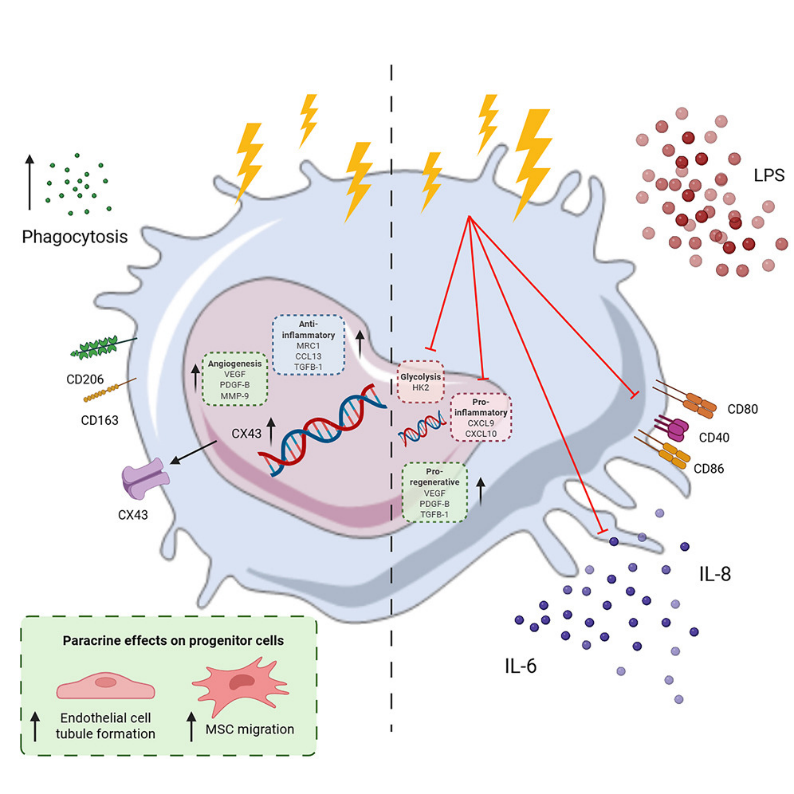 Клетки крови здоровых добровольцев подвергали часовой стимуляции с короткими электрическими импульсами. На выживаемость это не влияло, но макрофаги меняли поведение: активнее фагоцитировали, формировали вытянутые псевдоподии и начинали экспрессировать маркеры противовоспалительного фенотипа (CD163, CD206). Такой профиль сохранялся в течение трёх суток.